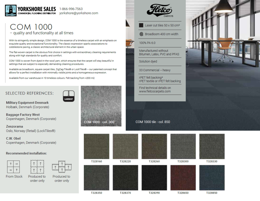 The flat-woven carpet is the obvious first choice in settings with extraordinary cleaning requirements along with high standards for quality and comfort. COM 1000 is woven from dyed-in-the-wool yarn, which ensures that the carpet will stay beautiful in settings that are subject to especially demanding cleaning procedures.